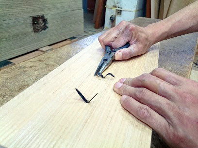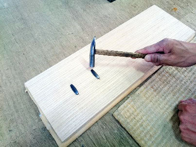 Pound the folded split fastener into the wood so that they can be covered with the split fastener cover to be installed later.