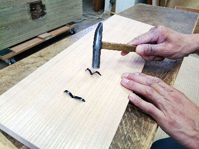 Align the holes of the handle plate over the drilled holes, and nail the handle plate to the wood.